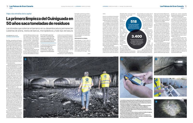 Por primera vez en medio siglo, el barranco del Guiniguada, soterrado bajo el asfalto y el hormigón de la capital grancanaria, ha sido sometido a una limpieza exhaustiva que ha revelado la magnitud de la acumulación de residuos en su lecho. Un reportaje de Adzubenam Villullas Santana en La Provincia / Diario de Las Palmas detalla cómo se han retirado 3.400 toneladas de basura en los últimos meses, entre el Rectorado de la Universidad de Las Palmas de Gran Canaria (ULPGC) y la desembocadura del barranco.