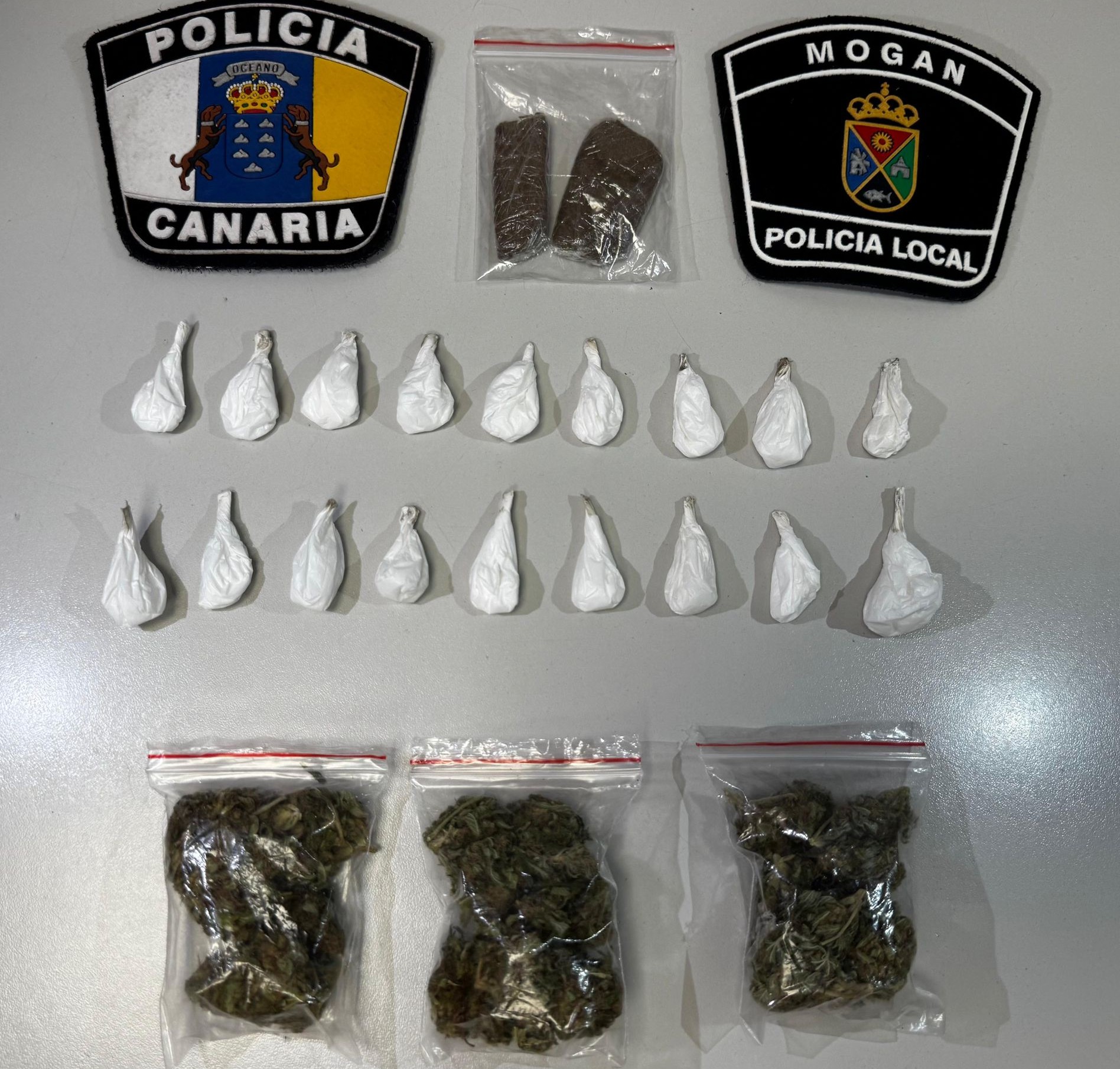 Agentes de la Policía Local de Mogán detuvieron en Puerto Rico a un hombre al interceptarlo en un vehículo de alquiler con tres bolsas de marihuana (11 gramos), dos piezas de hachís (6,3 gramos) y 18 envoltorios termosellados de cocaína (8,10 gramos).