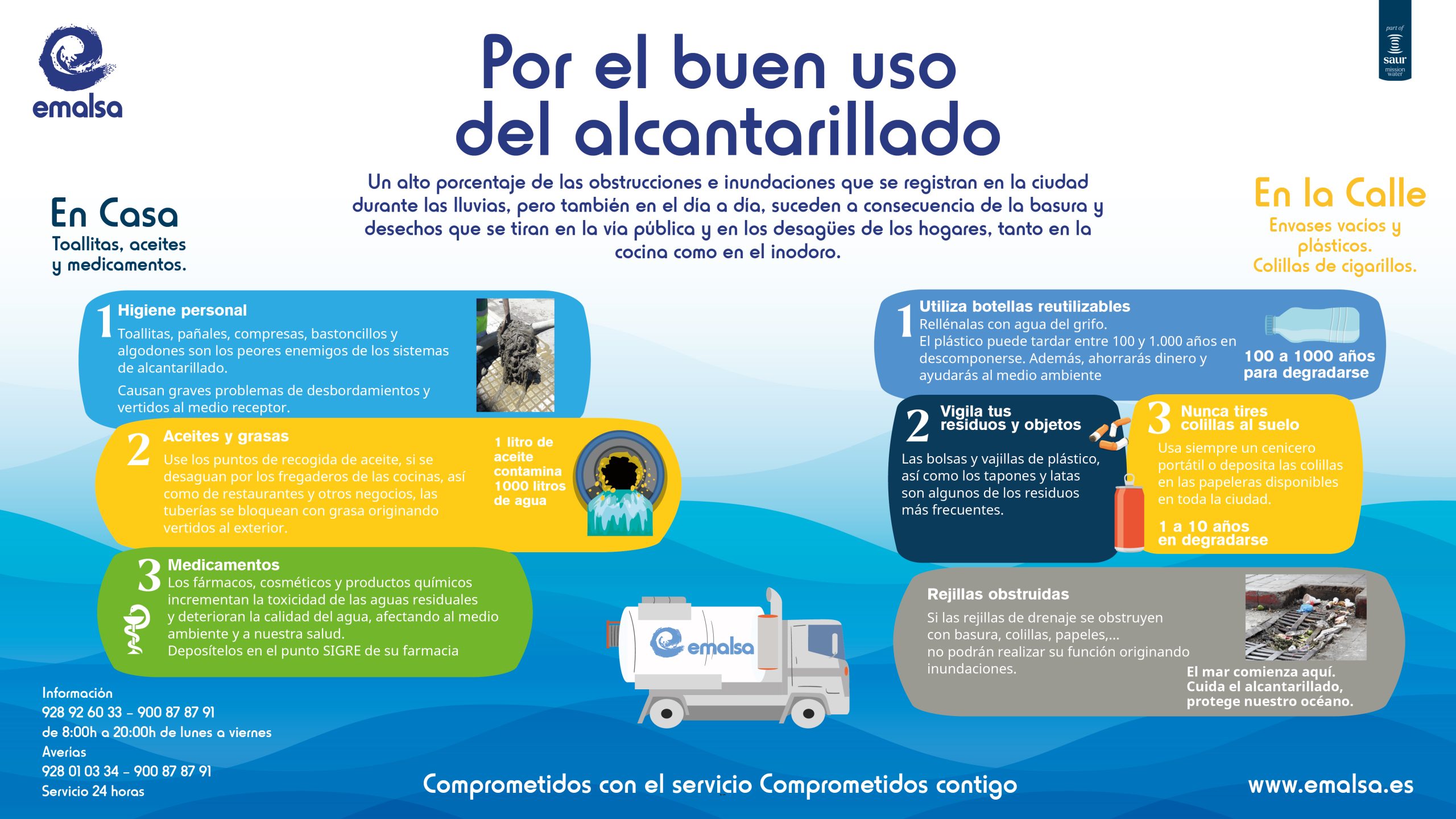 La empresa grancanaria, referente en la gestión integral del ciclo del agua, lanza una llamada a la acción ciudadana: "Todos podemos hacer algo. Tus acciones, por pequeñas que sean, ayudan a mejorar el saneamiento y a proteger la naturaleza". El mensaje es claro y directo: no tires toallitas, desperdicios de comida, aceites, medicamentos ni productos químicos al inodoro o cualquier desagüe doméstico, ya que estos residuos obstruyen las redes y contaminan el medio ambiente.