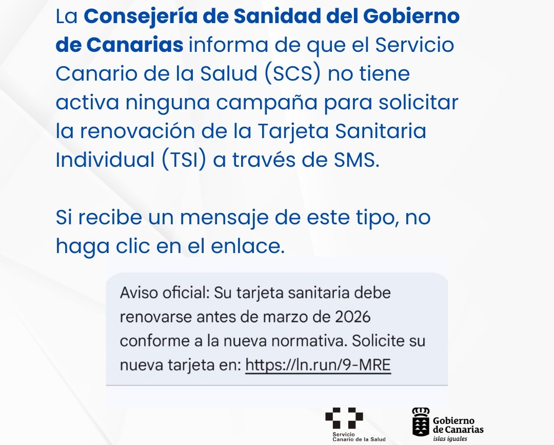 La Consejería de Sanidad recuerda a la ciudadanía que el Servicio Canario de la Salud no solicita la renovación ni la actualización de la Tarjeta Sanitaria Individual mediante SMS ni a través de enlaces acortados, y que nunca se pedirán datos bancarios para este trámite, por lo que ruega no responder a estos mensajes.